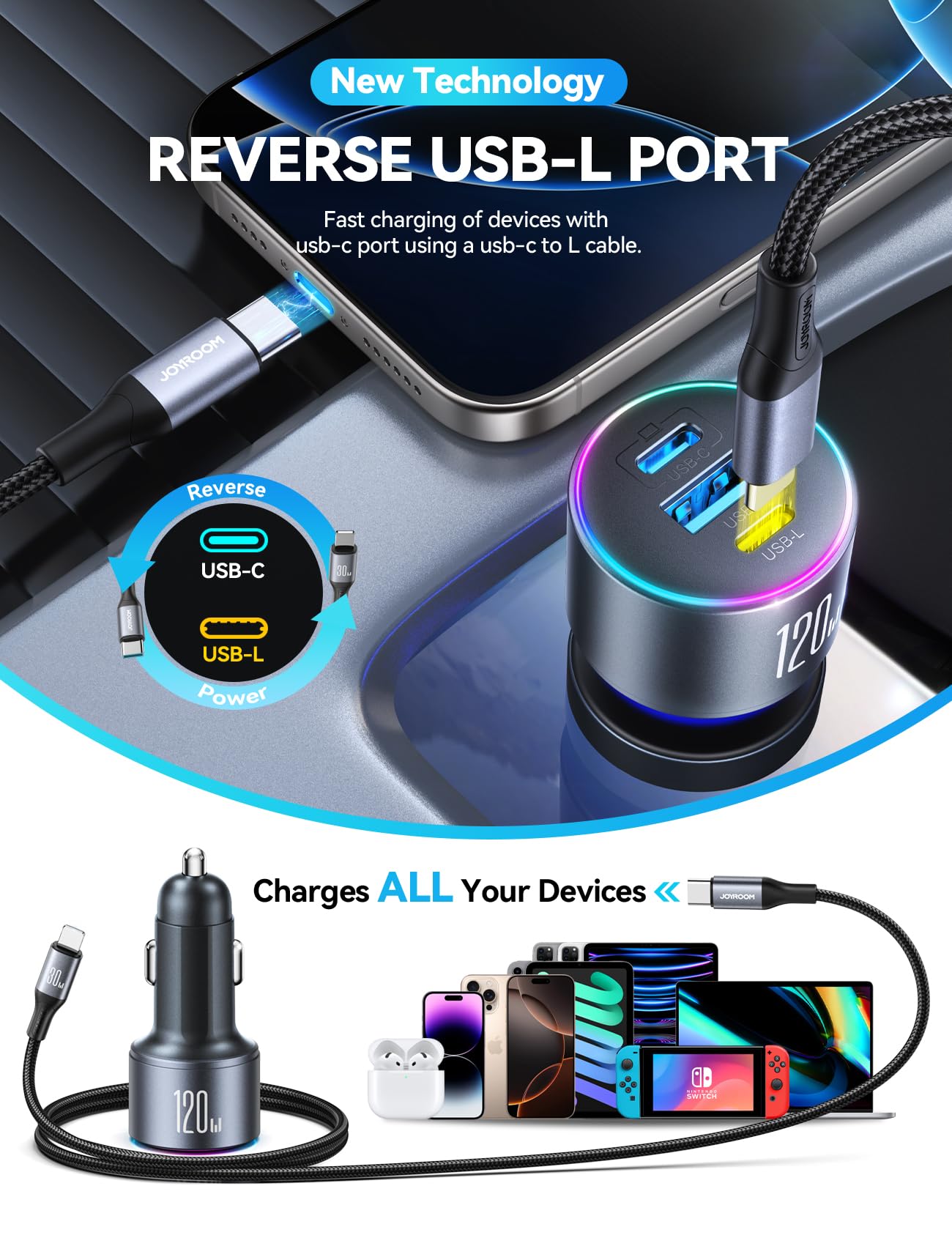 - [120W USB C Car Charger] JOYROOM 120W super fast car charger supporting PD 3.0, PPS, and QC 3.0 fast charging protocols, fully compatible with all devices. The usb c car charger can charge iPhone 17 to 85% in 30min and charge MacBook/iPad Air up to 80% in two hours. The utility of this device lies in its ability to support three simultaneous high-speed charging connections: USB-C, USB-A, and a unique USB-L port designed for iPhone 5–17 series and Samsung Galaxy S25/S24/S23/S22/S21/S20/Ultra