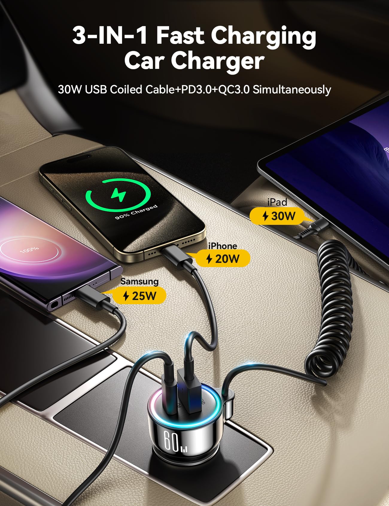 - Multi-Device Fast Charging: 60W fast car charger equipped with Type-C cable 30W SUPER FAST Charging for iPhone 16/15 series/Samsung S24/S23/S22 series, PPS PD30W, QC3.0 18W, support PD3.0/QC3.0/AFC and FCP super fast charging protocol. It can charge three devices simultaneously. Six times faster than 2.4A car charger