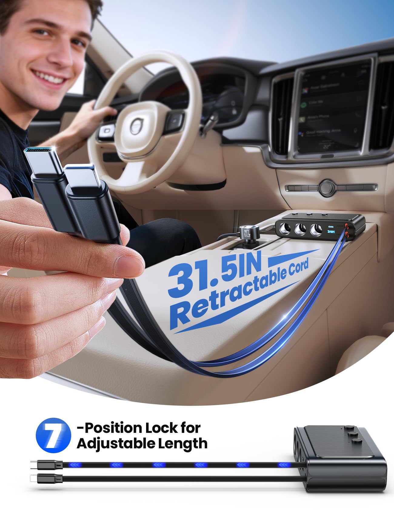 - 3.3ft extension cable + 31.5-inch retractable cords: Expands charging range to front/back seats and trunk—ideal for family trips/long drives, maximizing car port flexibility, Dual retractable Type-C+Lightning cables keep car interior tidy—Type-C supports 45W fast charging, Lightning 5V/2.4A, perfectly compatible with iPhones, Samsungs, tablets, and other devices