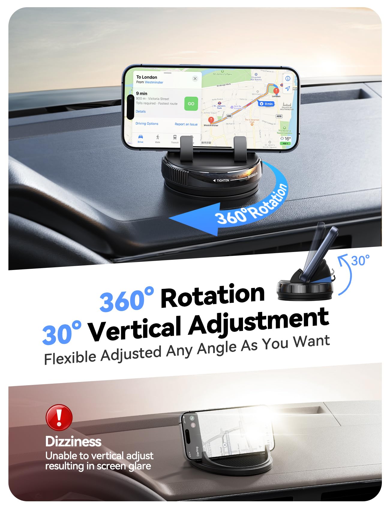 - 360° Rotation & 30° Vertical Tilt for Perfect Positioning: Enjoy total viewing flexibility with our adjustable cell phone car holder. 360° rotating and 30° vertical tilt allows you to angle your screen to reduce glare and match your sightline. Whether used as a stable iPhone car mount for GPS or as a hands-free viewing stand indoors, you can always find the clearest, most comfortable angle.