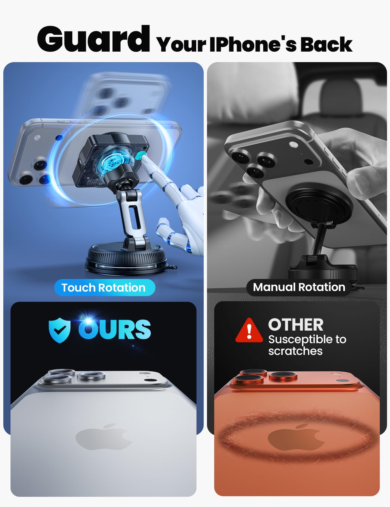 - 【Experience 15W MagSafe Fast Charging】:Power up your compatible iPhone effortlessly with genuine MagSafe speed. Its built-in strong magnets snap your phone securely into place, instantly aligning it for full-speed 15W wireless charging. Designed for life on the road, this mount keeps your iPhone powered quickly and steadily. For full-speed charging, please use QC3.0+ certified charger (18W minimum). Vehicle USB ports often provide insufficient current (recommend direct connection to charger).